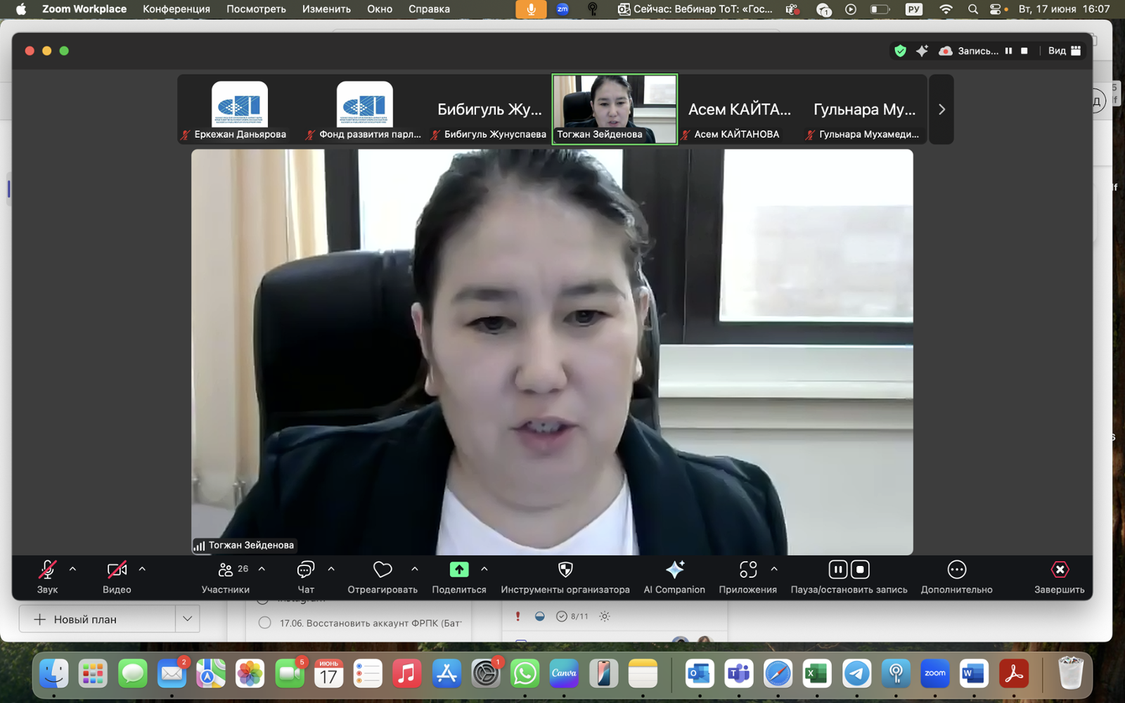 Foto 1. Webinar „Staatliche Sozialordnung (Entstehungsgeschichte, Überblick über die Rechtsvorschriften, Einreichung eines Antrags auf dem Portal, Informationen über die Datenbank für NGOs)“, 17. Juni 2025, Referentin: Zeidenova, Togzhan Dostiyarovna, Leiterin der Abteilung für die Unterstützung zivilgesellschaftlicher Initiativen des Ausschusses für zivilgesellschaftliche Angelegenheiten des Ministeriums für Kultur und Information Republik Kasachstan. ©IWO