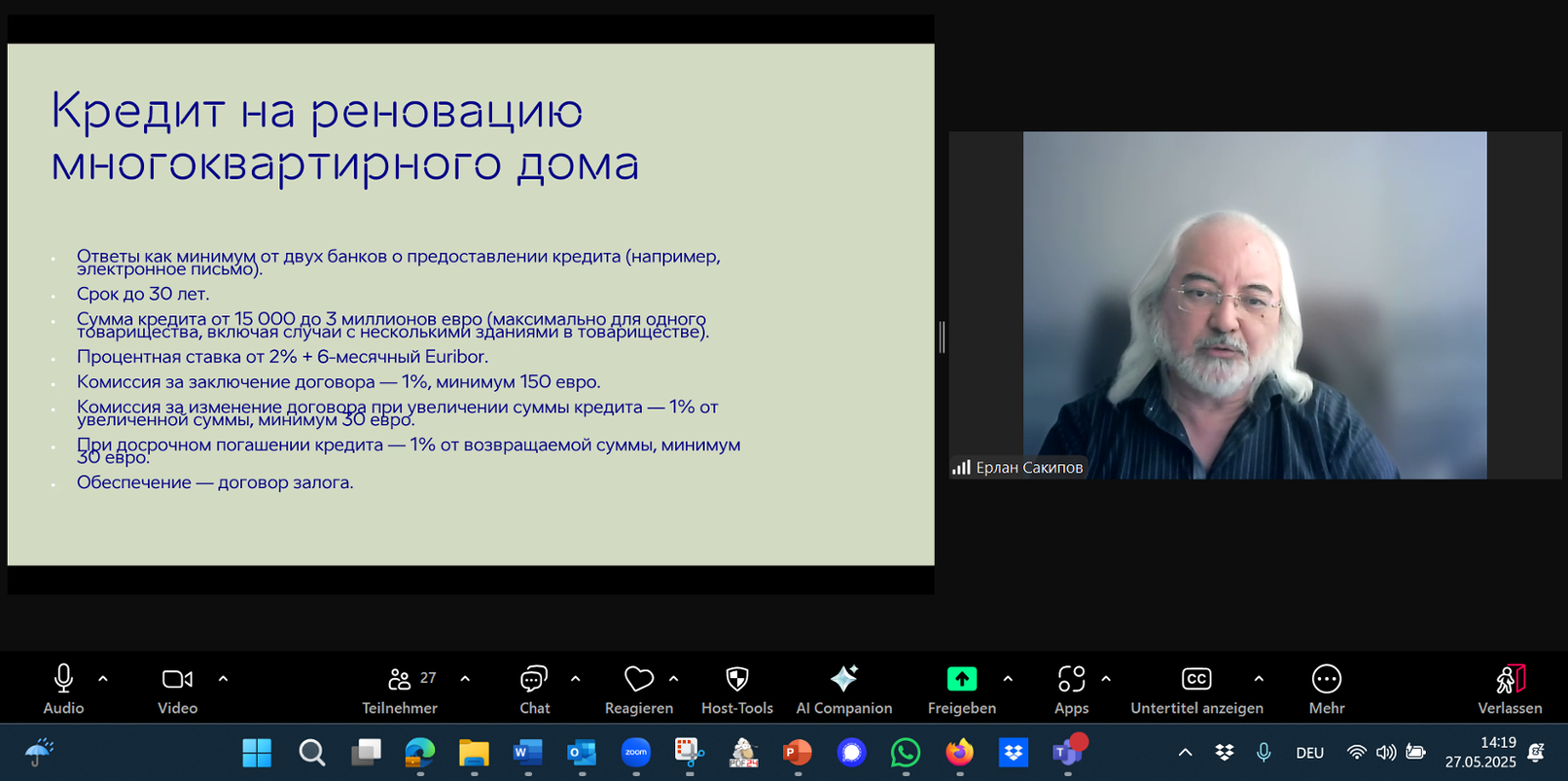 Foto 4. Aktiver Teilnehmer des ToT 2024–2025, Erlan Sakipov, „ARCHIPEL LLP“, Almaty ─ Das Thema „Finanzierungsprogramm für die energetische Modernisierung der Mehrfamilienhäuser in Estland, Webinar am 27.05.2025” stieß auf großes Interesse. ©IWO